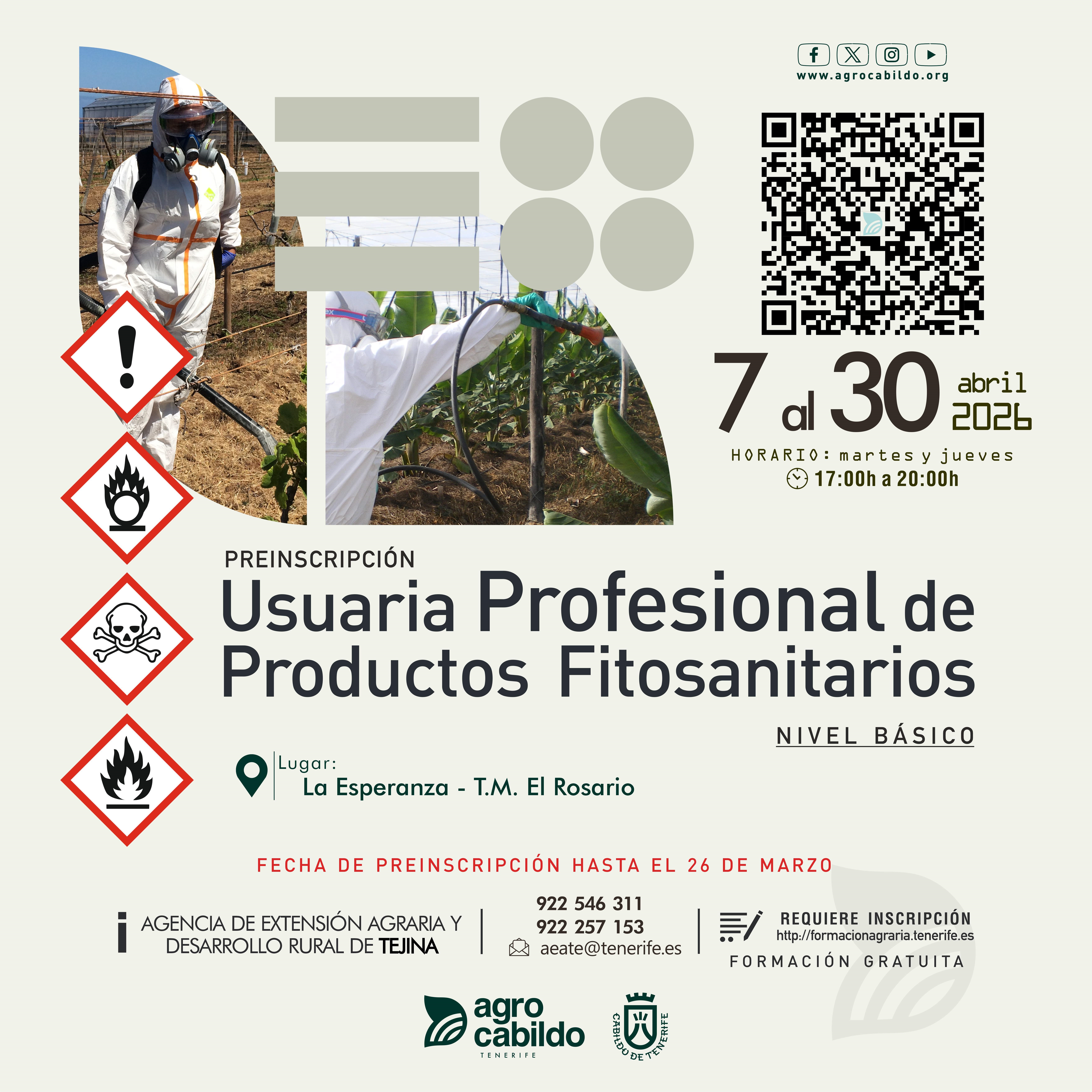 Dirigido preferentemente a mujeres. Martes y jueves, del 7 al 30 de abril, de 17:00 a 20:00 horas, en el Mercadillo Agrícola de El Rosario. PREINSCRIPCIONES HASTA EL 26 DE MARZO